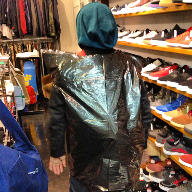 帰りもどしゃ降りですので慶太は肩肘張って完全防備。僕もチャリでいきなり本降りの時とかにやりますが、大き目のゴミ袋を頭出す穴を開けて着る。僕は身体は諦めてバックパックを完全防備するケースが多いっす。