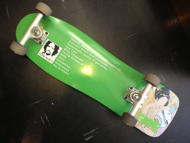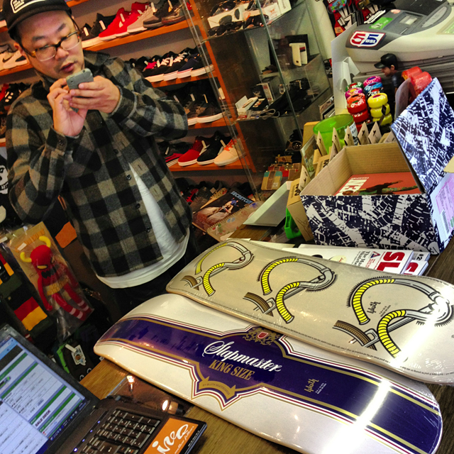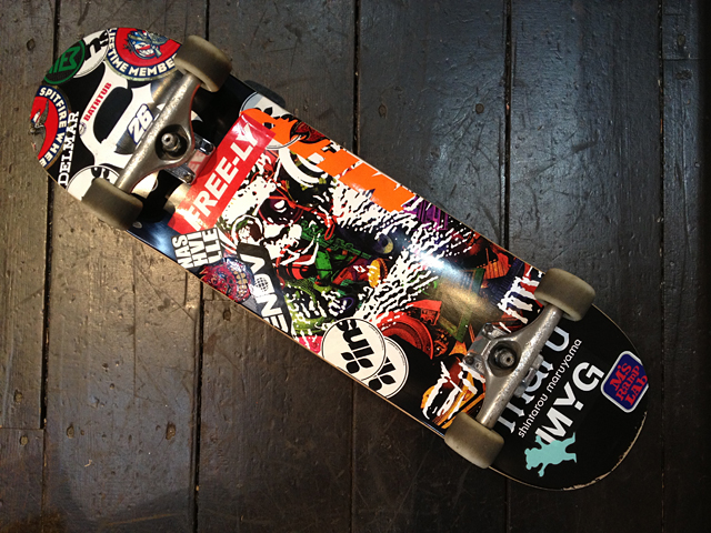 その後、このデッキを乗って常連さんのカンケさんがやってきました。お目当てはもちろんBLUTHのブレーキ無しモデル。乗って来たこちらのセッティングがまた見事でしたので拝見しておきました。これいいね。PUSHMASTER。これは杉ちゃん渾身の提案型デッキであります。ずっと昔からスケートボードをやっている人からしてみれば、80'sフィッシュテールのミニサイズ、って感じのシェイプですが、今のスケートボーダーにはとても新鮮に見えることと思います。まずノーズが短い。そしてフィッシュテール。そしてコンパクト。実際のところ、僕の記憶ではPOWELLのCABのミニにシェイプ似てる。でもやっぱりこのタイミングでリリースされるデッキとしてはとても斬新が感じがします。そしてこのレペゼンJAPANのグラフィック。春画って言いましたっけ?杉ちゃんに似合う。春画。歌麿であります。ここまで個性的なデッキってあんまりないでしょ?このスペックが、グラフィックが、琴線に触れてしまった方はぜひショップで実物をご確認ください。みんなと同じデッキは嫌だって人にはことさらグッとくるかと思います。