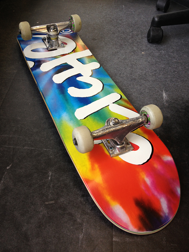 こちらは吉祥寺のタクちゃんが組んだコンプリートね。Evisenの8.5インチですよ。もう最近は本当にセッティングの幅が広がりました。ちょっと前まではデッキサイズのレンジは7.38~7.63位だったのに、今は戦闘機で7.38~8.5インチ、クルーズに至っては7.0~10.0インチくらいのレンジがあります。普通ショップに並んでるデッキテープは9インチ幅になるので、10.0インチのデッキには幅広グリップテープでしか対応できません。でもコンスタントにそういうセッティングのコンプリートのオーダーが入る事をみると、やっぱりおじさん復活組みは全国的に増えていると見た。今日も浦安ストアに「10年前くらいやめてから滑ってないんですけど・・・」って人が。いいね。僕の考えではスケートボードショップに足を踏み入れただけでもうかなりスケートボードにご縁があるのではないか、と。もうあーだこーだは無しにスケボー買っちゃって、と思います。インスタントでは現在「足回りセットのキャンペーン」を開催中ですから、セールデッキと足回りセットAで15.120円くらいからデッキが選べるコンプリートセットが組めるのです。いいでしょ?セールデッキも大増量されましたのでさっそくチェックしてみてね。最後の一本までしっかりと。