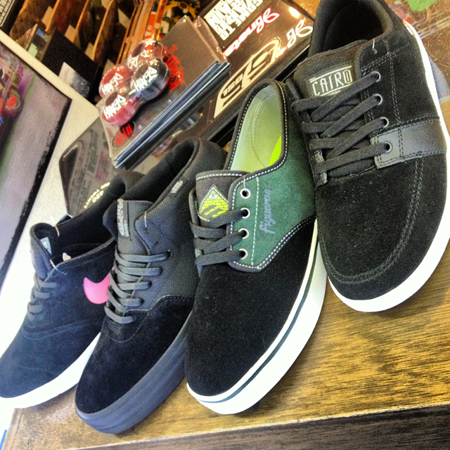 シューズは最近こんなのが人気です。右からetniesのCAIRO、EMERICAのFIGGY、VANSのCAB LITE、NIKEのKOSTON2の各モデル。やっぱりシグニチャーってスケートシーンに必要ですよね。シグニチャーから色々生まれる気がします。おススメのシューズは色々ありますのでご遠慮なくスタッフに聞いてください。