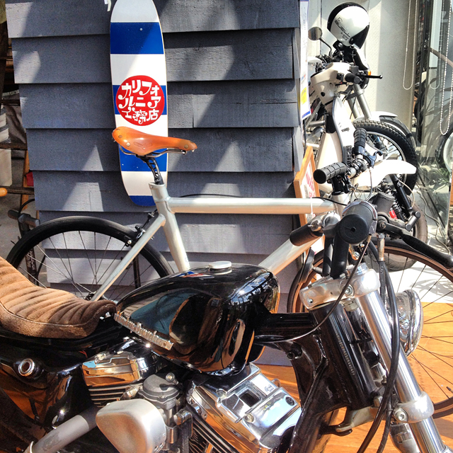 中はいろんな機材が並んでたり、バイクやピストやスケートボードや家具や工具や本当にいろんなものが並んでいて男子はグッと来てしまうものが山盛りです。僕はステンシルのシートが売っていて、それマジで買っちゃう勢いでした。アルファベットのステッカーとかさ。打ち合わせよりもプラプラしてた時間の方が長かったかも。