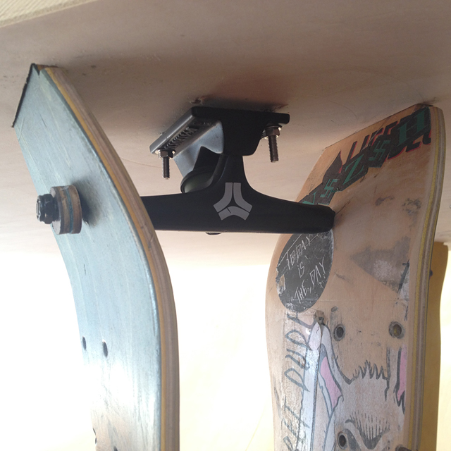 だってさ、ちょっと気がつくとテーブルの足がこんな感じだったりするのよ。すごく素敵。カリフォルニアのテイストで統一されておりますのでやっぱりスケートボードは外せない。こういう使い方は見た目はまったく見えませんが、気がついたときのグッとくる度がかなりハイレベルであります。