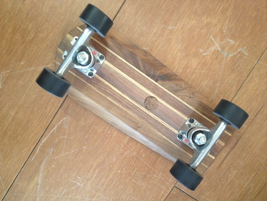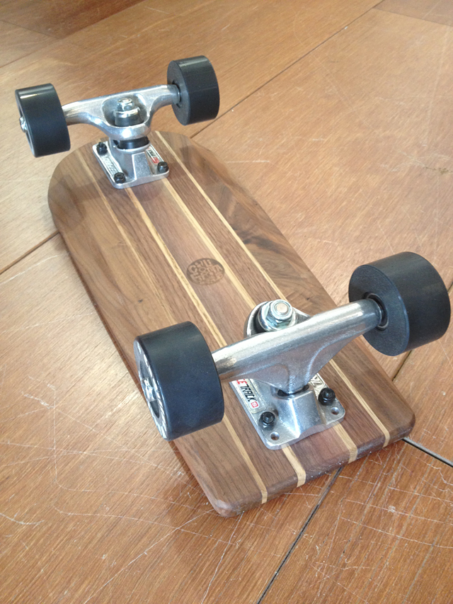 こんなのもありますよ、って持って来てくれたスケートボード。このデッキがアツいね。ウォールナット?なんだろう?かなりデッキ自体は軽い合板でした。驚いたのはそのシェイプ。これスケートボーダーの発想だったらすごいね。ノーズとテールはありません。でもプッシュで移動するにはかなり小回り利くサイズ。このデッキはたぶん乗るためじゃなく組まれたものだと思いますが充分乗れるスペック出てると思います。ただやっぱりテールがないのでレールの踏み込みで方向を変えるしか方法がない。なので大事なのはセッティング。クイックに曲がれるようにトラックは柔らか目がいいと思うよ。こういう遊び心あるスケートボードを試しに作っちゃう大人たちがもっと増えると楽しいね。
