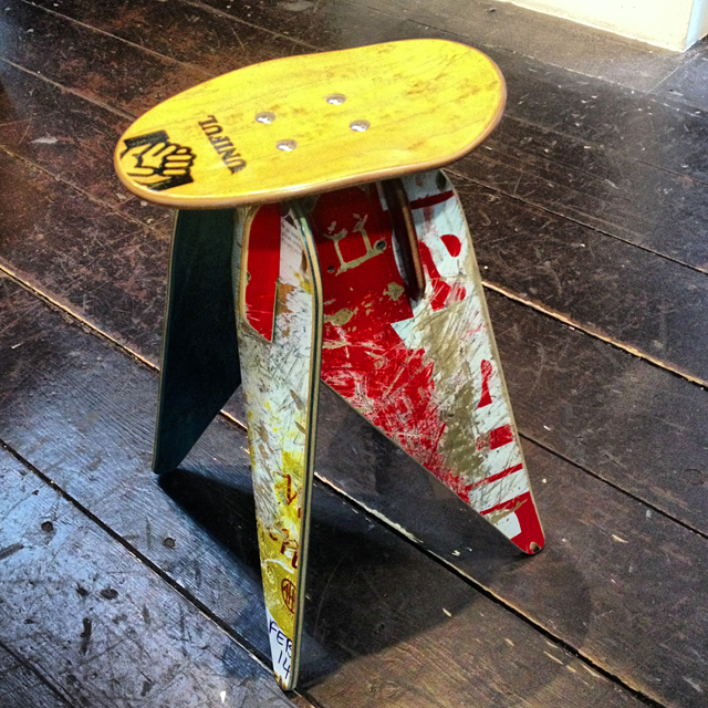 そのカリフォルニア工務店の自信作がこちら。吉祥寺ストアに寄贈頂きましたスツールなんですが、座ってみると驚くよ。座面に使ったデッキを切り出す場所が調度良いコンケーブが付いているところを使っていて、座るとシックリ来てしまうのよ。さすがだ。これは5枚のデッキを使って作られるスツールですので素材としてはかなり豪華な感じです。やっぱり乗り終わったデッキは捨てずにとっておけばよかった。DTSの乗り終わったアーロン5枚使ってこれ作ったらかなりグッときそう。