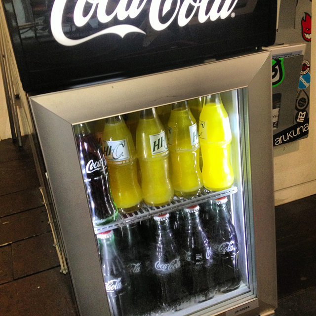 吉祥寺ストアには冷蔵庫があります。今はコーラとオレンジジュースが入ってます。店内で飲めます。季節やタイミングでジンジャエールになったりしますし、たまに予想以上に需要が高くて空っぽになってしまうこともあります。これからの季節はショップで話しながら飲んでる人が増えてきます。春からまた季節が変わっていきますね。夏は毎日のようにいっぱい詰めてもすぐに空になってしまうんです。