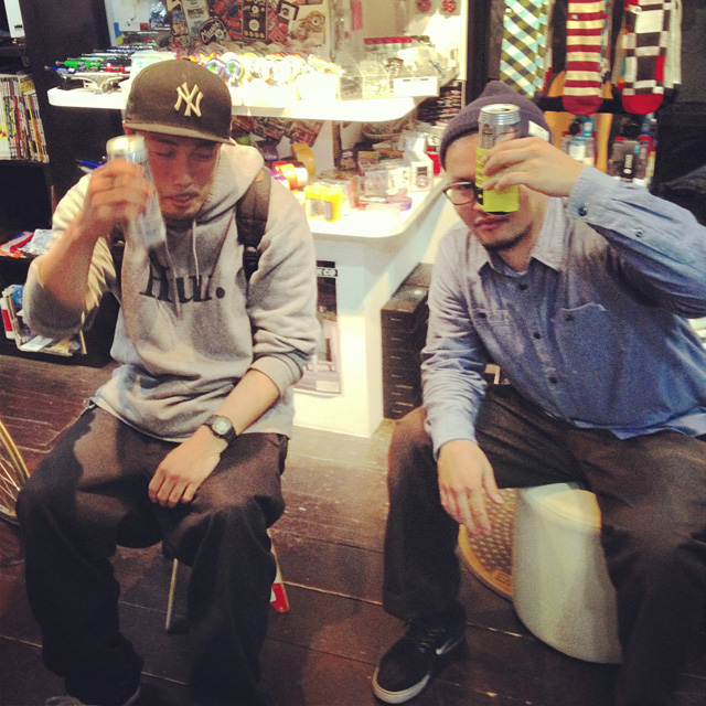 会場入りする前には吉祥寺ストアにダブル石井が揃いました。セットで見るのは久々です。石井ちゃんも石井ちゃんも身体が大きく気は優しくて力持ち。葛西の石井ちゃんはまたカナダへ戻る準備をしております。津田沼の石井ちゃんは素敵な写真を撮ってます。instantハウツースケートボウ道で50-50をご紹介してもらってます。二人はやっぱりスケートボードが取り持つご縁であります。そうそう、浦安ストアの看板になっているコンプリートデッキの大往生トラックは葛西の石井ちゃんの作品です。ぜひショップにお越しの際にはギリギリまで削られたハンガーのVENTUREをチェックしてみてくださいね。ハンガーはもちろんピポットブッシュも削れてますから。あそこまで使ってもらえればパーツとしてもうれしいでしょう。