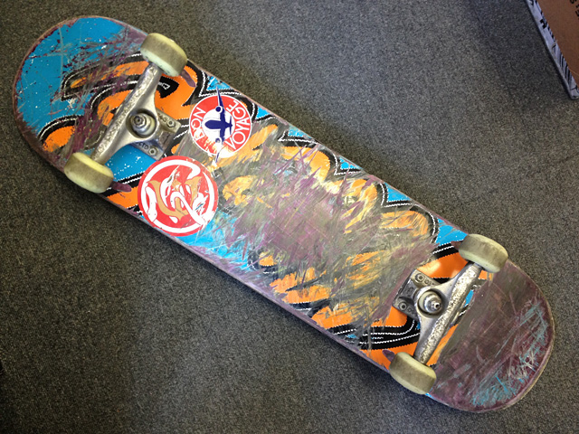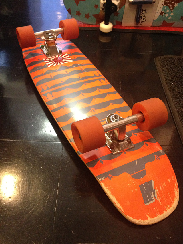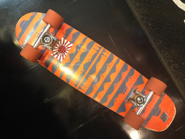 納品で来てくれたHIBRID早川大輔のクルーズデッキであります。ダイちゃんはリシェイプもお手の物で、僕も以前リシェイプしてもらったことがあります。そっごくいいシェイプでした。自身でHIBRIDを運営しておりますので、デッキのスペックやセッティングにうるさくない訳がありません。前にチャリで遊びに行ったときに、垂れステムにライザーバーって下がって上がるのがなんか納得できないって話しになりました。心の底から共感しました。だって意味無いじゃんね。なにか理由があってそうしている居るんだったらいいんだけど、そうじゃないなら必要ない。そういうセッティングがスケートボードでもあるんです。ま、最終的にはどんなセッティングでも乗っている人が良しとするならばそれでいいんだけどね。そんなダイちゃんのセッティング。僕は個人的に興味深々なのですよ。デッキはHIBIRDの・・・。あれ、こんなデッキはリリースされておりません。聞いたらやっぱりサンプルみたいね。最新モデルのグラフィックが載ったサンプルデッキでありました。サイズはどれくらいかな。目測7.75インチって感じかな。クルーズデッキは目測が難しいね。デッキのシェイプ自体はベーシックなもので工場のモウルドである型をプレスした感じかと思います。スケートボードってまずはデッキじゃないですか。個人的にはデッキが決まらないとトラックやウィールなどのセッティングがまったく見えてこない。なのでウィールやトラックからコンプリートを選ぶことは僕はほとんどありません。