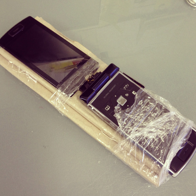 そして浦安ストアに来てくれたのはアドバンスのYUUMACこと佐藤ゆうや先輩であります。成田のYUUMACがアドバンスの敏腕営業マンになり、現在はBRIXTONなど担当する期待のホープに。さすがだ。YUUMACは以前、国際空港に勤務していて、来日するプロライダーや出国する国内ライダー達の情報をいち早くつかんでおりました。そんなYUUMACが取り出した携帯電話がこちら。ガラケーですが、もうなんだかわからない。完全に真っ二つに折れようとしている携帯をギプスを付けてなんとか使用している感じです。さすがだ。これをみて僕は「物の本質」ということを考えてしまいました。携帯電話を所持する目的のひとつとして通話があります。この電話は会社携帯なので通話がほぼ全ての所持する目的であります。だとしたらキレイじゃなくてもコンパクトじゃなくても、通話が出来れば目的は満たしている。そう考えるとこれは遊びや余裕はないがまったく問題のない携帯電話ってことになります。なんだそれでいいんじゃん、ってことになります。こちらもある意味シンプルイズベスト。
