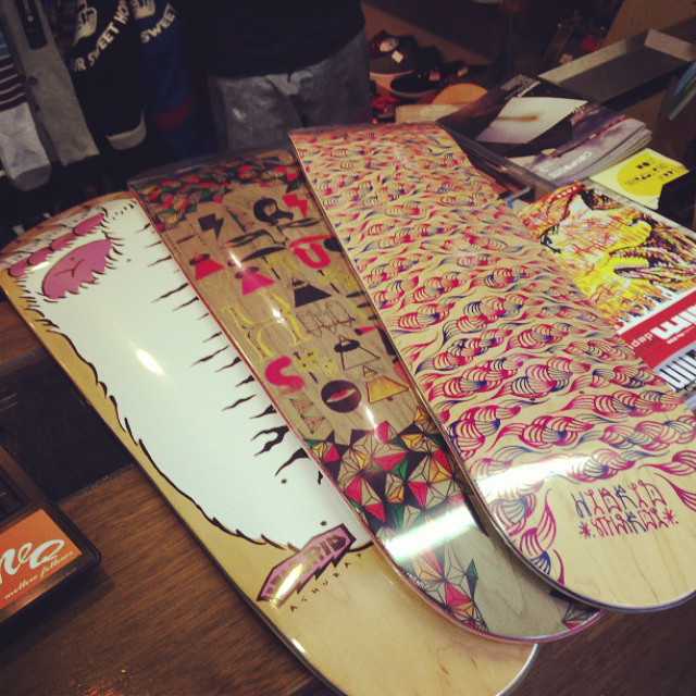 HIBRIDの新作も届いてます。これもまた素敵なグラフィック。ダイちゃんがデリバリーに来てくれるのもうれしいね。やっぱり定期的に会えると色々話せていいですわ。instantsユウトも積極的にシューティングに参加してるらしく、どんなのが出てくるのか楽しみで楽しみで。デッキはどのモデルも個性的でらしさがあって素敵です。夏本番でいっちょデッキを新調して滑りに出かけたいところです。