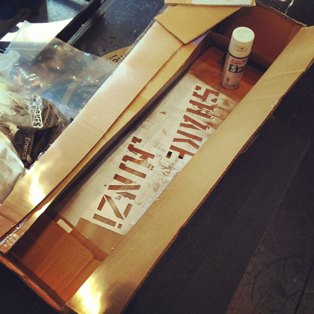 先日、吉祥寺ストアにSHAKEJUNZIが登場しました。最近は好みのデッキを見つけると浦安か吉祥寺かで受け取る場所を決めて来店します。今回はオリジナルSHAKEJUNZIグリップテープをステンシルするのに必要なマイダンボールを持参しておりました。さすがだ。このダンボールはステンシル好きにはオススメよ。横開きのデッキを入れるダンボールなんですが、この箱にデッキとかグリップテープとか入れてスプレーをぷしゅーっと。周りを汚さず、ササーっとステンシル作りが終了します。今回かなりウケたのが、このダンボールを使用後に送料到着払いで自宅に送っておりました。さすがだ。それでこそSHAKEJUNZIであります。ステンシルもすでにかなりのスキルでもうプリントしたみたいに作っちゃいますからね。そして僕もそのグリップを出来る限りのシンメを出してデッキに貼るように心がけております。今回はかなりいいの出ました。渋谷のパークとかでSHAKEJUNZIに会ったら見せてもらって下さい。