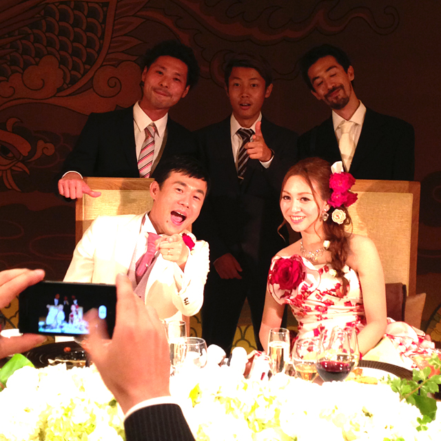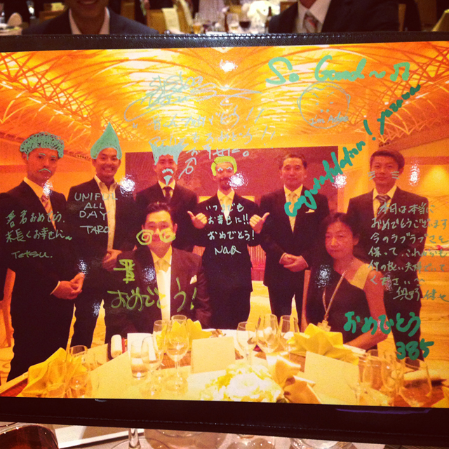 僕はこちらのテーブルでした。PIC矢沢さんやチャーリーの安井くん奥村くんにチームUNIFULなテーブルです。隣の席のM&SMITHのみやこさんとも色々お話しできました。隣のテーブルのcoyaさんにアカチメンにura3にムラケンにトミーにトオルに立木くん、って完全に悪乗り友人テーブルが気になってしょうがなかったっす。ありがたいことに主賓の祝辞のご指名をいただきまして、色々考えましたがストレートに「スケートボードが大好きだ」という僕らの思いを話させていただきました。立ったまま聞かせてしまったのが心残りでありますが、なんかあらためて日本のスケートボードシーンでの岡田晋の存在感を感じました。ちなみに顔の落書きは僕のは最初に自分で書きました。オッケンに矢沢さんに落書きしちゃおう、って言ったのに書いてくれませんでした。僕も書けなかったけど。