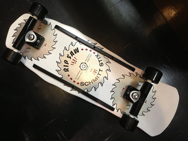 ってことで拝見してみます。このSSPナカジのデッキをみて90年代を思い出すおじさん達もいっぱい居るかと思います。当時、僕もこのRIPSAWというデッキが大好きでした。メインストリームのPOWELL、DOGTOWN、SANTACRUZではないメーカーのデッキであるということ。シェイプがものすっごく斬新であること。デザインが個人的に好みであること。僕のファッションリーダーのUNIqueナオキが乗っていた事、など様々な要因が重なって、このモデルだけで5枚くらい乗った気がします。パープル、ナチュラル、レッド、ブルー、のプライは記憶にりますが、当時もホワイトあったかな?ちょっと定かじゃないっす。RIPSAWはこの後、RIPSAW2やCHAINSAWなど広がりを見せます。LA CLUBに三野くんがRIPSAW2を持ってやって来た時にはかなりの衝撃を受けました。でもやっぱり僕はこのRIPSAWが全ての面で秀逸かと思います。今見ると10インチ幅ってかなりごっついですね。この復刻を前に見て思ったのですが当時のシェイプと違うんじゃないか、って。記憶では9インチくらいの気がするんだけどね。ま、復刻なのでその辺はぴっちりしてると思いますが記憶では当時そんなに太いデッキじゃなかったきがするのよね。ナオキがクリアグリップの下にケンタッキーおじさんのステッカーを貼ってて、そのサイズ感を考えても9インチくらいだった・・・。いや、もういいです。