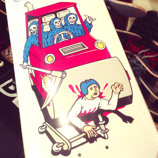 こちらはPOLARの最新モデル。ポンタスさんのグラフィックは毎回いいですね。僕はスケートボーダーのこういうセンス大好きよ。アメリカのスケートパーク行くとキックボードや自転車で走り回っている人多いのよ。前回の串刺しとかギロチンとかもシュールでしたが、今回のローラーもかなりです。もちろんギャグです。たぶん。