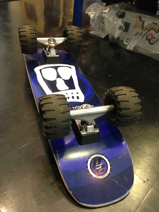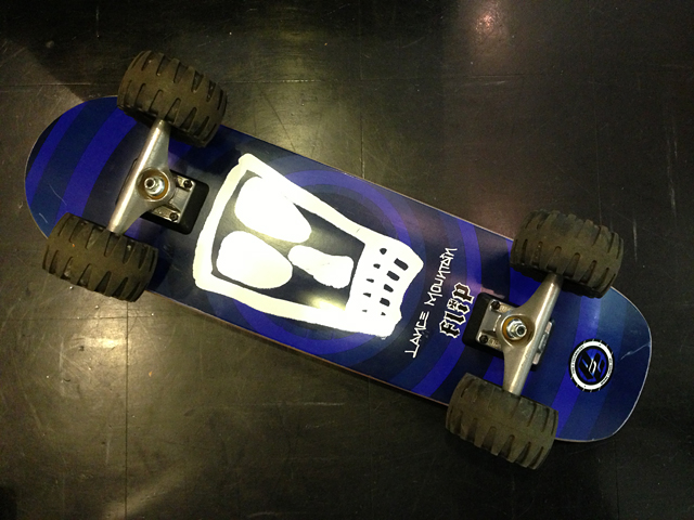 お祭りのインスタントブースに前にはちょっと変わったスケートボードを転がしておきました。たとえばこちら。これは僕の乗りたかったデッキにオフロードウィールを組み込んだセッティングになります。ビジュアル的にちょっと良くないっすか?勝手なイメージではランボルギーニ チータなんですがね。いや、アタックバギーかな。このウィールは大きさは正確にはわかりませんがかなりデッカイす。また中空ではないのでごっつい重い。でもなんか気になるでしょ?そして普通の道路でプッシュするのはちょっとタルい。これは公園の丘とかを芝生ダウンヒルするのにいいセッティング。川原の土手はかなりセメントマッチでした。土手は下手すると死ねます。こういうヘンテコリンも嫌いじゃない。