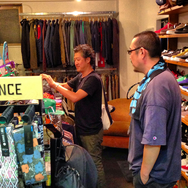 そしてある日の浦安ストアには僕の一番古いスケートバディーのUNIqueナオキとBFTCのチャーリーがご来店。もう何年だ?そろそろ30年だよ。すげーな。ジャブジャブ池が新宿で有名なスポットではありますが、実はジャブが流行る前は中央公園の噴水広場でジャンプランプを出してました。そこがローカルスポットの始まり。当時はジャンプランプが定期的に出ているのが原宿のホコ天、上野のホコ天、辻堂の太陽の広場、埼玉の航空公園、って感じ?ローカルレベルではもっと色々ありましたが、電車やバスに乗って集ってくるスポットってあんまりなかった。おっとジャブの話しだったわ。で、僕は新宿に通ってましたが、最初の頃はジャブよりはジャンプランプ。たまにシュウジがランプ出せない時とか、早く行ってランプ待ちの時とかにジャブに行って練習してました。そのうちNEW SCHOOLの波が来て、そこからはジャブが集合場所になりました。