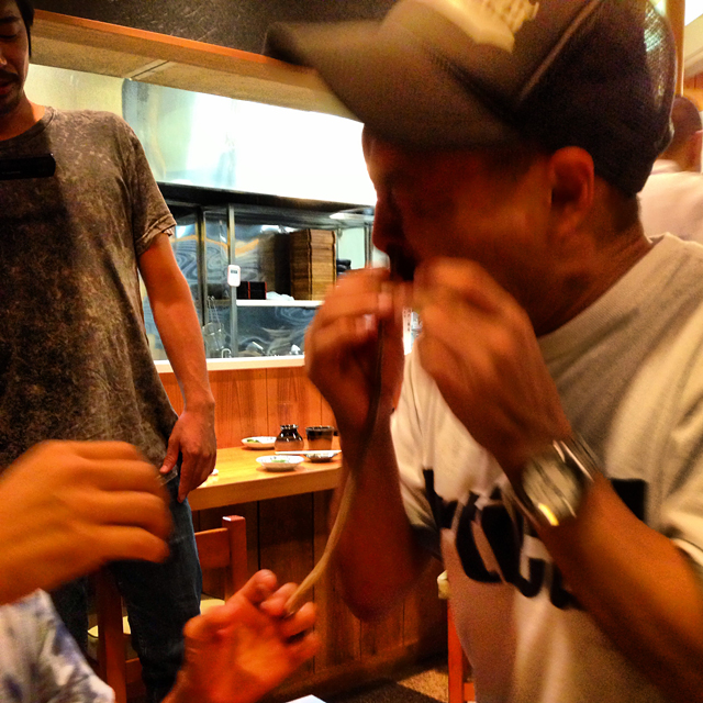 先日12日にオープンしたinstants中谷のお店「手打ち蕎麦ちんねん」に、新宿ローカル3人で行ってきました。浦安の駅から歩いて行ける場所に実に中谷らしいお店が出来ておりました。僕やナオキやチャーリーは中谷が中学生の頃からの付き合いですので、なんか独立開業のお祝いとは別のうれしい感情がふつふつと。黄色い犬のぬいぐるみ来て新宿のダブルセットを飛びに行ったことや、B7とかにコンテスト出場しに行ったこと、浦安の僕らの最初のローカルスポットでスケートボードに明け暮れたことや水曜日の体育館スケート日のことや、ま、色々ありました。今は素敵な嫁さんとカワイイ娘っ子とすごく幸せそうな家庭を持ち、この独立開業で新たなステップに踏み出した訳です。修行していた蕎麦屋さんでは6時に家を出て終電で帰り、休みの日にもそばを打つ練習にお店に出ておりました。6年の修行ではありましたが、独立する目的を持ち続けて鍛錬してきたのでただ勤めていたのとは全く違うモチベーション。さすがだ。