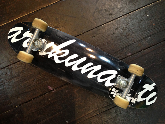 デッキはサトルがディレクションしているarukunaのクルーズデッキであります。これ大人気だった。2種類あってarukunaらしいカラーとデザイン。サイズは7.75インチなんだけど、クルーズは一番太い部分でデッキサイズを測るので、このデッキは全長がやや短めなのもあって機動力高いスペックになってます。M4じゃなくてMP5。実はとっくに完売になってたデッキなのですが、サトルはこれ隠してたね。うふふ。そんな大事なデッキを使っちゃうのもいいね。記念のデッキって乗れないからどんどん貯まっていくからさ。僕もグッときたデッキは乗らずに貯蔵庫に入れちゃうケースもあって、インスタントの記念デッキやLOGOデッキの全カラーだけじゃなく、PUSHEADの好きなグラフィックのとかHAROSHIの最初の奴とか気が付けばなんだか色々キープしてあった。シューズもそうで、ショップの倉庫からOSIRISのD3が出てきたり、es KOSTON2やDCのLINX、VANSのLAMPINとかCONVERSEの前のスケートモデルとかね。おっと、そんなのどうでもいい。サトルちゃんのクルーズはトラックがACE11、ウィールはRICTAのソフトウィール57mmでありました。ベアリングは見なかった。このセッティングかなりクイックな感じよ。深夜でも家の前からプッシュできる感じね。自分だけのクルーズデッキが組みたい方はぜひご来店ください。