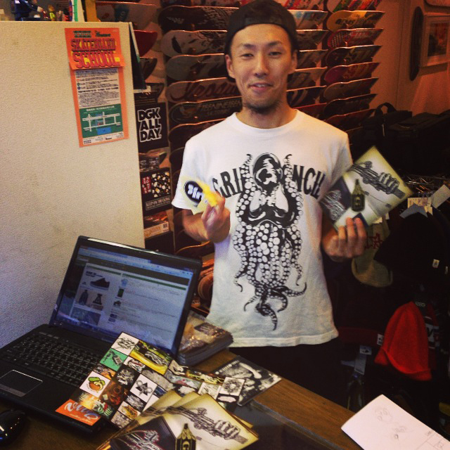 大坂からヘイちゃんが来ました。facebookなどで噂のカワカゼパークが気に入って引っ越してしまった逸材であります。なのでコタツをはじめタカユキとか山梨クルーとみんな仲良し。で、聞けば新潟でライブペイントに出演するので途中でスケートショップに寄りたくなって来てくれたみたい。いいね。僕もよくやる。ダルマランプや先日の塩谷祭りの7thランプもヘイちゃんが書いてるんだって。スケートボードは色々な繋がりを生み出します。また新たなご縁に感謝。