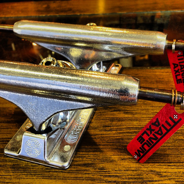 そして待望のINDEPENDENTのTITANであります。これいいね。グッと来た。持って見るとやっぱり軽い気がする。実は重量的には軽くはなっているけど驚くほど大きな違いがないのですが、よく見るとグッとくるところが色々と。シャフトとかベースとかキングピンとか。ま、手の取ってチェックしてみるのが良し。INDYフリークはじっくりとチェックしてみてください。もうショップには並んでますwebストアも更新を急ぎますが、早く乗りたい方はフォームか電話でご連絡下さい!!