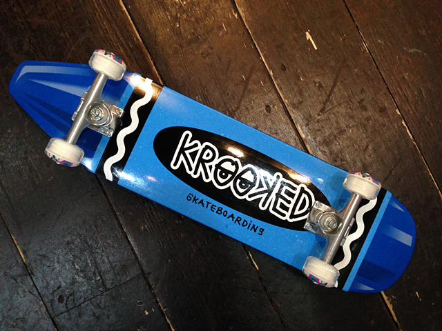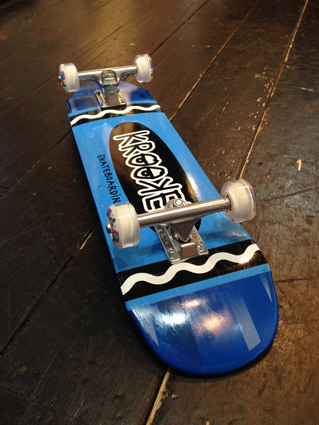 こちらは吉祥寺ストアでセットアップさせて頂きましたクルーズセットであります。これいいでしょ?KROOKEDのクレヨンデッキ。セッティングも色々悩みましたが、現在ご提供している「足回りセットE」で組んでみてみました。かなりカチッと来ましたよ。トラックはデッキのサイズに合せてACE33に。ウィールはSATORIのNABEですよ。54mm。クリアなカラーはもちろんですが、なんかサイズバランスが僕の中ではすっごくピタッと来た感じ。ベアリングはNINJA abec3が装着されております。この足回りセットってデッキに合わせてトラックのサイズを選びますので、お客さまは本当に好きなデッキを決めるだけ。Eセットはウィールが2種類ご用意してますのでデッキのグラフィックや好みに合わせてお選び頂けます。