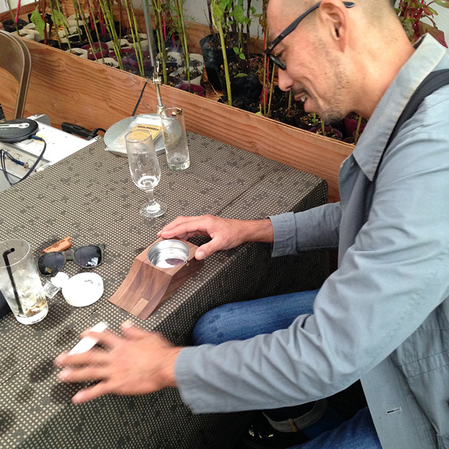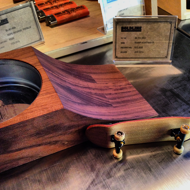 これまた驚いたジャンプランプ灰皿!何度かサンプルを作りながら素材の木材の硬さなどをテストしてかなりガッツリ重厚感のある灰皿が完成しております。驚いたのがそのスケール感で、ランプのRや灰皿部分の大きさがかなりグッと来ます。フィンガーボード好きは見たら絶対にやりたくなる感じね。回し技で灰皿を飛び越えるスキルを身に着けたい。吸い殻が入っているときにはちょっとセメントマッチになっちゃうよね。失敗すると吸い殻が飛び散るから。そこをスパッとトレをメイクする自己満足っぷりに乾杯。BARにあってもいいね。フィンガーボードしながら飲めるし。大人のフィンガーボード。うるさいけど。なんじゃそりゃ。この展示会には驚きがいっぱい詰まっておりました。次シーズンから全国のスケートショップでBLODLINEのアイテムがチェックできるようになるかもしれません。楽しみだ。