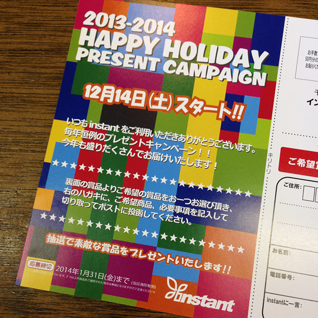 そろそろクリスマスが近くなってきてキッズコンプリートセットのクリスマスキャンペーンのご注文が増えてきました。もう少しでなくなっちゃうので気になっていた方はお早めに。また、今年も「HAPPY HOLIDAY プレゼントキャンペーン」がスタートしました。このキャンペーンは期間中ご注文いただきました方に、税抜き5000円ごとに抽選ハガキを一枚お渡しして、ご応募いただきました方の中から画像の賞品をプレゼントしちゃうぞ、ってキャンペーンです。人気商品はちょっと倍率上がりますが、それでもただのスケボー屋の規模なのでそんなには倍率高くない。抽選も毎回厳正にやらせてもらってます。配達のヤマト運輸の担当ドライバーに引いてもらったり、ショップに来たライダーや友達に抽選してもらったり、なるべく僕らが引かないように厳正にやってます。で、抽選が終わると毎年ドラマがあるのですよ。ある人は3年連続当選したり、ショップの超常連さんが当選したり、僕らにしかわからない色んなドラマがあるのであります。今年はどうなるのでしょうか。ご応募ハガキを手にされた方はぜひ奮ってご応募下さい。また店頭でご購入の方にも同じように抽選ハガキをお渡しいたします。その場でご記入いただければ投函せずにエントリー完了。ぜひ。