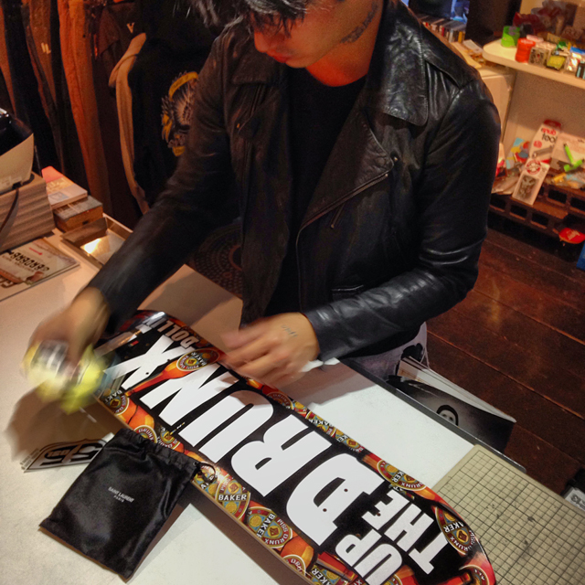そして吉祥寺には街で噂のSHAKE JUNZIがやってきました。「今年最後のデッキは本間さんにデッキテープを貼ってもらおうと思って」って。うれしい限りであります。そう言ってもらえるの光栄であります。いつもよりピシッとキレイに張ったつもりではありますが気に入ってもらえたでしょうか。デッキテープを貼るとステッカーの時間です。JUNZIくんは大好きなサンローランのポーチからステッカーを引っ張り出してかなりピチッと貼ってました。ウィールも同じメーカーの白と黒の同じスペックのカラー違いを1セットづつ買って白2個黒2個で使ってる。さすがだ。あ、拝見するの忘れてしまった。
