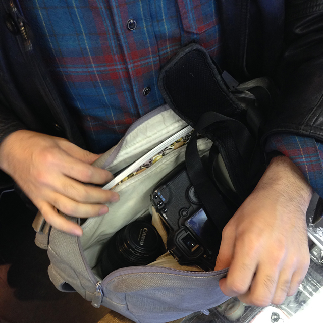 なんだか普通のバッグに見えるけど、中はやっぱりカメラバッグでした。僕もちょっと写真撮るので人のカメラバッグ見るの超好きなんす。ISEKIくんのとかISAMのとかタイミング合ったフォトグラファーのカメラバッグを見せてもらう事もありますが、やっぱりそれぞれの味が出てるんですね。ISAMはフィルターがいくつも入っていたし、ISEKIくんのは撮影のたびに中身が変わっている雰囲気が出てました。レンズ群の構成とか、ストロボとスリーブとか、サブ機はなにか、とかじっくり見るとかなり面白いのよ。ま、写真好きな人以外は全く面白くないと思います。
