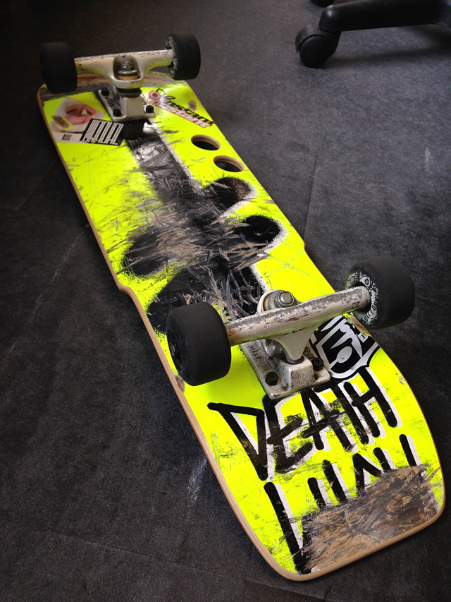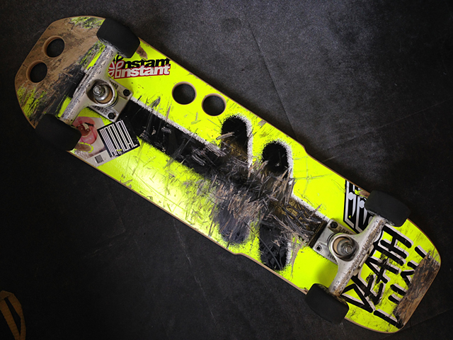 で、KUROちゃんが組み立てに来たデッキを拝見いたしました。これいいっしょ!DEATHWISHのリメイクデッキでありますよ。KUROちゃんのご兄弟が職人さんで、乗り終わったデッキをリシェイプしてクルーザーにしてくれたそうです。それにしてもこれかなりの見事さでありますよ。まずこのシェイプ。テールがしっかり踏めてノーズも適度に残し、ホイールベースは14インチそのままにかなりの機動力を見せるかと思います。また、個人的にメリケンサックと呼んでいるこの穴。これはデッキを立てに持っても横に持ってもしっくり持てるための穴。特に素晴らしいのがその「仕上げ」でデッキの切断面はすべてスムースにサンディングされております。もちろん穴の中も。こういうところに職人魂を感じます。さすがだ。
