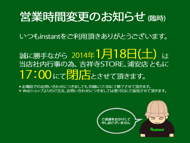 今週土曜日は社内行事のため、浦安ストア、吉祥寺ストア、ともに17時の閉店となります。ご不便をおかけいたしますが何卒ご了承のほどよろしくお願い致します。