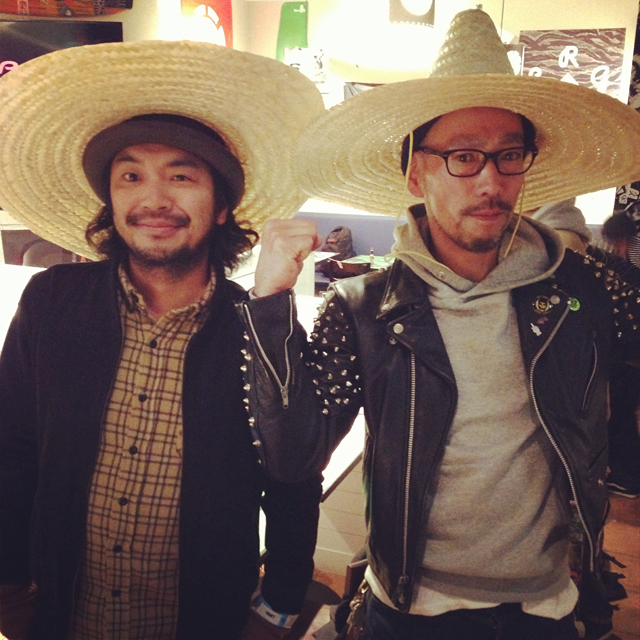 今回はひさびさに祭りMCを担当させて頂きましたので、写真が全くないのです。タネちゃんにお願いしてあるので、後日またパーリーの様子をご報告させて頂きます。唯一撮った写真がこちらの2AMIGOS。浦安のご近所さんMINDの看板であり、SURREALをプロデュースするキーくんとご存じRAD龍であります。こやつらのソンブレロの似合いっぷりハンパないっす。本当は僕もNEWライダーもみんなソンブレロの予定でしたが、僕は小さくてかぶれなかったし、NEWライダーの引きっぷりも凄かったので今回は浅岡、サトル、カツミのオリジネーターがソンブレラーとなりました。コンテスト超面白かった。結局賞金は二位のセキが10670円くらいにまで伸びたので、優勝はテンマ、賞金王はセキ、って結果でありました。詳しくはタネちゃん待ちでまた。