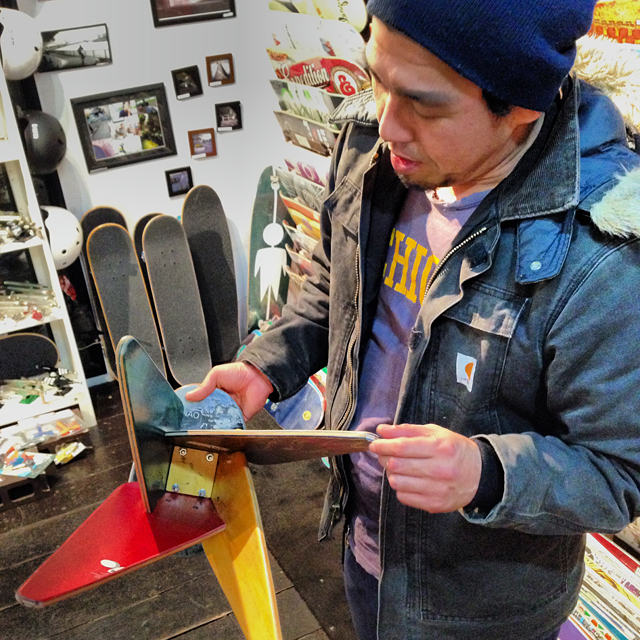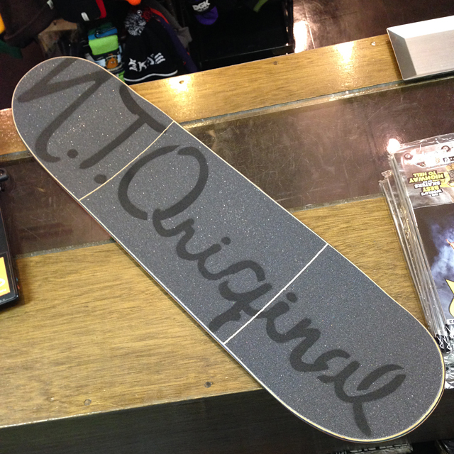また浦安ストアには朋友コヤちゃんがデッキを換えにやってきました。色々チェックしてましたが、最初からN.T.Original×緑道会の8.0インチに決まってたみたい。さらにグリップテープもNTOなんですが、今回は渾身のデッキテープ貼りをメイクしまして、僕的には今までの19年のスケート屋人生で一番上手く貼れたかも、って感じ。こういうクリティカルヒットがたまに出るのですが多分見た人はその違いがわかりません。デッキテープ貼るのを成功したとか失敗したとかじゃなくて、なんかこう「キタコレ」な感じ。コヤちゃん、たぶんこれ調子いいよ。