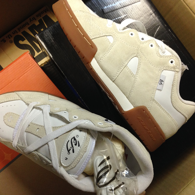 で、今年初めてのAJSA全日本スケートボード協会の会議に行ってきました。今年度の流れなどに関して、事務局長横山さん、YTS西川さん、インタースタイル長谷川さんやジェッツ森テッチャンらと色んな話をしてきました。ふと見たらシューズの箱がいくつもあって、OSIRISとか気になる箱もあったので全部開けてみたところ、こちらのesのKOSTONを発見しました。esって1995年創業でインスタントと同級生なのもあってとても好きなシューズブランド。TOM PENNYやCHAD MUSKAもここ出身だし、KOSTONもPRODもPJも、みんなここを通って大きくなっていきました。そのKOSTONのファーストシグニチャーがこちらのKOSTONです。KOSOTON1って言ってたっけ?同時のフルゴッツなスケシューから比べるとシンプルで履き心地も良かった。esのライダー達がみんなこのモデルを履いていたのが印象的です。シューズ見ただけで色々フラッシュバックするのは一種の病気だね。また次回AJSA事務所行ったらなんか掘ってみます。
