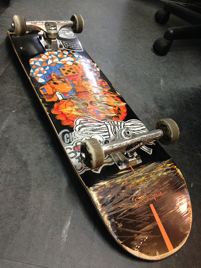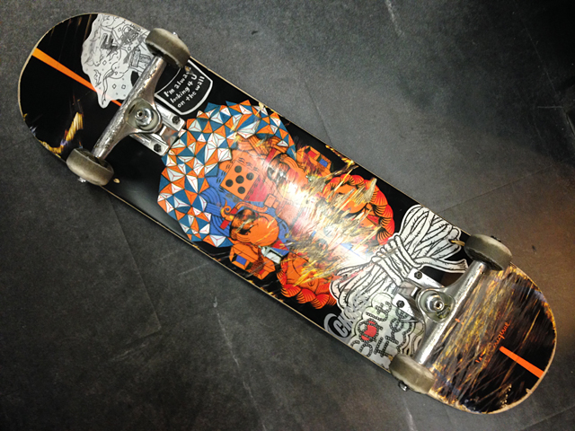 でね、こちらは最近デッキを新調したchoiceのcoyaさんのセッティングであります。もう来店前から決めていたN.T.Originalの緑道会でありますよ。8.0インチ。なんかずっげーいいっすね。色んな繋がりがこのセッティングから読み取れます。デッキやパーツのスペックだけではない「アガル」理由があれば、毎日のスケートボードがさらに魅力的になることでしょう。デッキってグラフィックも大事ですよね。基本的に考えてみれば工場がチョイスしたデッキにブランドごとにグラフィックが載せられて商品となって消耗される。スケートボードは生まれながらにしてぶっ壊されることが確定している刹那的なアイテムなのであります。グラフィックなんて上手い人は数回滑ったら消えちゃう場合もあります。で、も、ね、やっぱりスケートボードをする以上、どこかになにかの魅力を感じているに違いないのです。ある人は自分のメイクにとことんこだわって何枚もデッキをつぶしてひとつのメイクを追いかける。グラフィックより、より的確に自分の乗り心地の好みに適合するか、ってことが優先順位。またある人はズラッとならんだデッキをじーっと眺めてお気に入りの一本を選びます。サイズはさほど大きな差がなければグラフィック優先でデッキを選ぶ人もいます。僕は正直なところ、どちらもクリエイティブなスケートボーダーだと思います。そしてそういうスケートボーダーたちが認知されていくことがシーンの活性化につながっていくと。日本人っていうか僕もそういうところがあるのですが、カテゴライズしたがる傾向、ステレオタイプな思考、に傾倒してしまうところがあって、「スケートボーダーはこうあるべきだ」とか「スケートボーダーならこうしなきゃ」みたいな声を聞く事もあります。でもそんなの全然関係ないっす。自分が対峙するスケートボードでいかに楽しく、いかに気持ち良く、いかに盛り上がれるか、って言うのが滑る目的でいいと思います。もちろん人としてのマナーや礼儀は必要です。それはスケボーじゃなくても同じこと。おっと、またおじさんの小言っぽくなっているのでこの辺で。