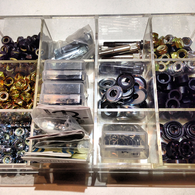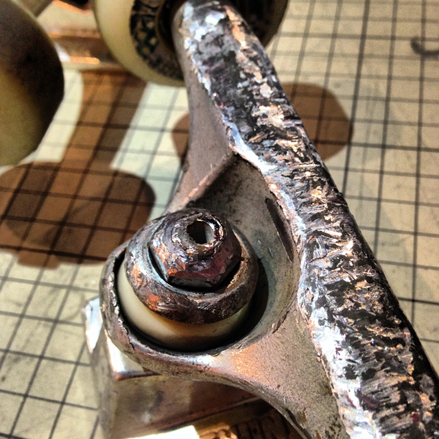 春はデッキやトラックやウィールなど、使い古したパーツを交換に訪れる方が増えてきます。先日も近所に住むダイゾーくんがやって来て、デッキやトラックを交換して行きました。交換して外したトラックをみて驚いた。僕のスケートライフで二人目の円錐キングナットを発見。一人目は長野の山口くん。最初見た時にはかなり飛ばされました。日本も広いな、ってマジで感動したものです。山口くんのセッティングはinstantsの「元祖 デッキ拝見!」でも最初の方にピックアップしておりますのでチェックしてみてください。この円錐型キングナットというのはですね。ブッシュの締め具合をこまめに微妙に調整しながらはじめて形成される彫刻のようなものなのです。わかる人は多いと思いますがブッシュゴムって季節によってだいぶ硬さの感じ方が変わるものなんです。冬の間は硬くなり、夏になると柔らかく感じます。その調整をこまめにして自分のベストなところをキープする。そうやって作られるのがこの円錐型キングナット。しかもダイゾーくんのすごいところは、これスッと外せてピチッとまたナットが入りました。かなりグッときた。ここまで使っていると普通はナットが外れにくかったり外れてもナットが入らなかったりするのですが、まったくノーストレスで外れてはまる。本人が意識しているかどうかはわかりませんが、僕の中ではかなり最上級の工芸品であります。