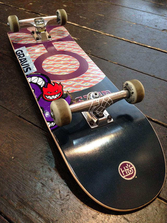 そんなダイゾーくんのセッティングがこちら。愛媛のスケートヒーローでありますが、こちらでも立川や吉祥寺ですぐに人気者に。一緒にFUGにも行きましたが、スケートスタイルは「サラリ」であります。サラリ王子のJOYNT林くんと先祖同じかも。そんな訳ねえ。でも僕的には「サラリ一族」として勝手にカテゴライズしちゃいます。どんなトリックもサラッとメイク。汗はかくけど汚くない。コケるしスラムもするけれどなぜか動きが優雅なタイプ。インヒール絶品。フラットもカーブもランプも全く死角無し。なんか今のシーンの最前線な感じあります。スケートボードの多様性はすごいね。デッキはずっとLesque乗ってましたが8.25インチがなくて今回はこちらのHABITATの8.25インチを。「コンケーブきついの慣れるかなー」って言ってましたが絶対にすぐ慣れちゃうって。上手い人ってもちろん好みはあるかと思いますが基本的にはなんでも乗れる。慣れちゃうし乗れちゃうのよね。ずるい。