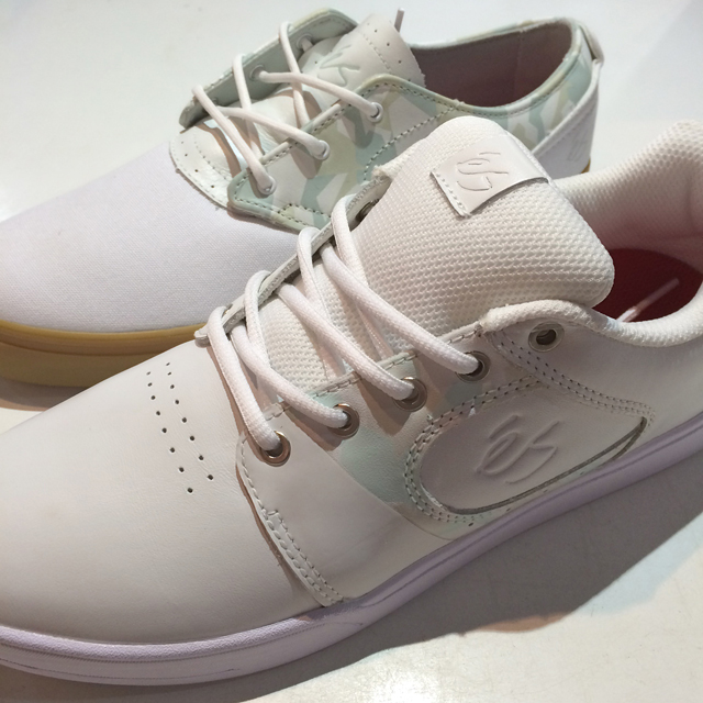 こちらは人気のesのNEWカラーが到着です。白いシューズってかなり夏ですね。最近のシューズはスッキリしててスケートだけじゃなくて普段使いにもオススメできます。スケート対応の耐久性の高さ、そして人とは違う感じがします。ハードなライディングにも対応するためクッショニングもとことん追求されてます。見た目にはシンプルなシューズでも「スケートシューズ」ってだけでものすっごい技術が詰め込まれているのです。各社最新技術を惜しみなくつぎ込んで開発してますので、毎シーズンの新作リリースが本当に楽しみです。