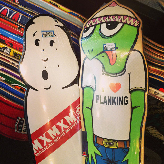また最近はクルーズデッキを組みにいらっしゃる方が急激に増えました。やっぱり陽気がいいとプラッとプッシュしたくなるからね。最近のクルーズセッティングは本当に自由になりました。パーツもたくさんのバリエーションから自由にお選びいただけるし、デッキも画像のような気になるシェイプのものからスタンダードな木の葉型まで色々ご用意しております。逆に、初めてクルーズデッキを組もうとするとデッキやパーツのサイズセッティングや組み合わせに悩んでしまうかも知れません。そういう時にはプロショップ。色々なデッキやパーツから気になるものをピックして組み合わせて置いてみて比べてみて選んでみる。とても贅沢な時間だと思います。もちろんwebでのお問い合わせにもプロショップの視点から対応させていただきますので、スケートボードのことでしたらお気軽にお問い合わせくださいね。お待ちしてます。