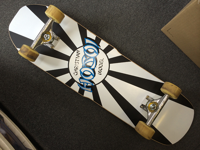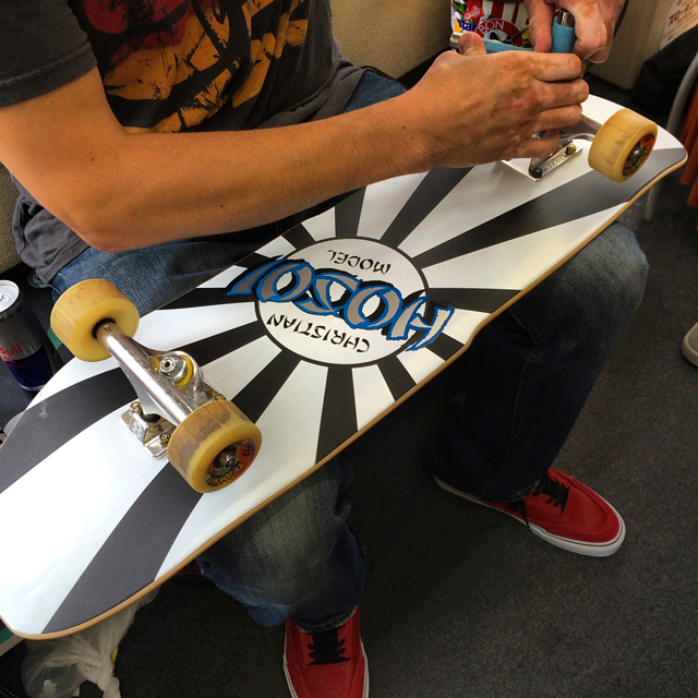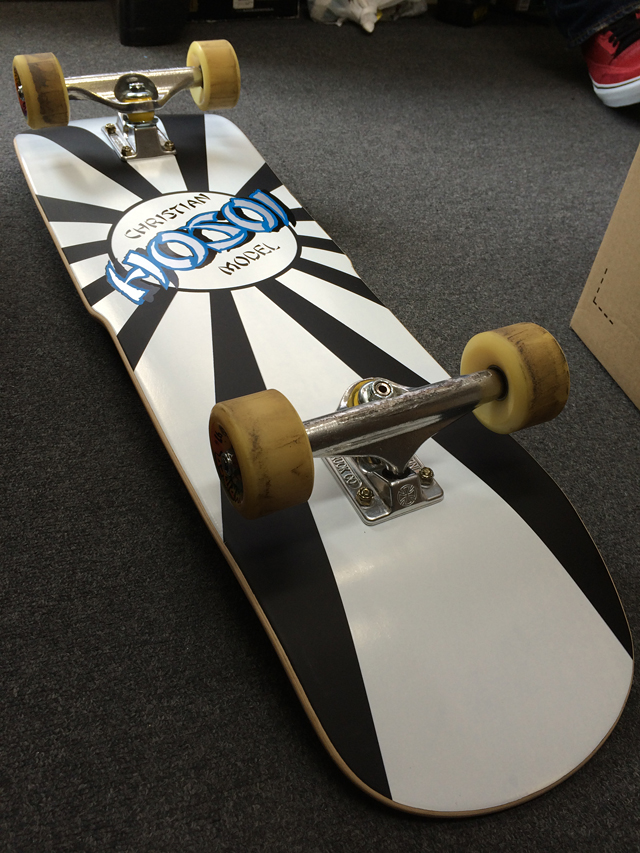 こちらはプラッと来店した門前仲町の兄貴のコンプリートセットであります。なんかこれ見た感じでグッときませんか?往年のカリスマ クリスチャン・ホソイのシグニチャーデッキでかなりひきつけられてしまいました。組んでみて乗せてもらったらこれすっげーホイールベースが長いのよ。プールやランプの安定感ハンパないと思う。そしてこのスペックでハイスピードカービングからテールを蹴れたら僕の中ではもうゴール。スケートボードの表面的ではない魅力を体感できる気がします。なんだかよくわからんな。セイちゃんはこうやっていつも僕を楽しませてくれるですが、なにより一番自分が楽しんでいる。10インチのフィッシュテールでも最新のデッキでもなんでも自分のトリックは全部できる。そして上手いし楽しそう。あのガタイでランプ滑ってるの迫力あるのよね。ランプがすっごく小さく見える。乗れてる人はなんでも乗れる。ロングボードでもクルクル回す。本人が気持ち良いかは別ですが。それは僕の持論。