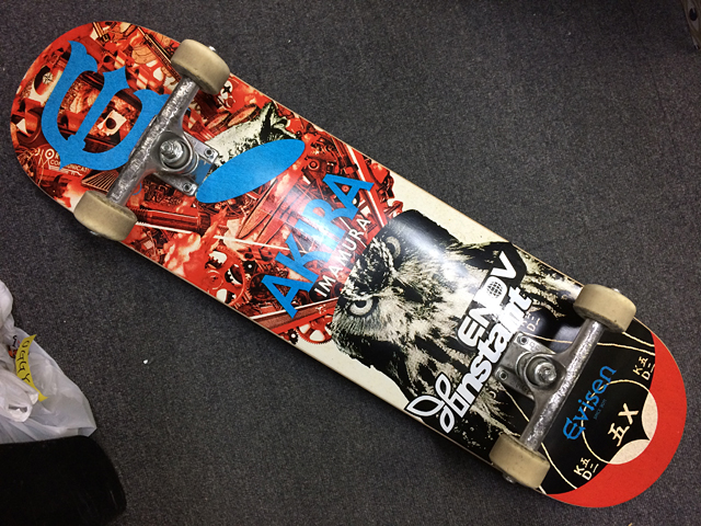 そしてそのSATANIC CARNIVALで大暴れしてきたinstantsアキラのセッティングがこちら。デッキは一時期8.25インチまで大きくなりましたが、最近は8インチちょいって感じがお気に入りのようです。スケートボードってやっぱりグラフィックも大事だけどスペックも大事、スペックも大事だけどグラフィックも大事。人によって優先ポイントが違うし、タイミングでも変わってくるようですが、最終的には自分の中でグッとくるかどうかが一番大事なのではないでしょうか?グラフィックもサイズもそういうグッとくるためのファクターのひとつであって、絶対に必要な条件って訳ではないようです。EvisenのAKIRA8.125インチ。アキラがAKIRAじゃん、って今頃気付いちゃったりします。さすがだ。