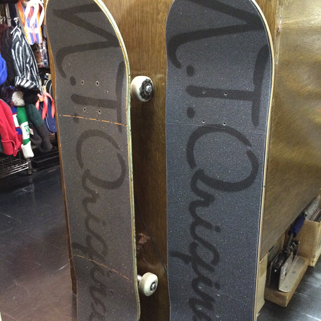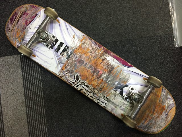 交換する前のデッキがこちら。SK8MAFIA×SHIN OKADAのゲストボードでありますよ。アツい。コヤさんはその昔、秋葉原の駅前広場のローカルで、集る若手達とCHOICE CLOTHINGというブランドを立ち上げ、日本のスケートシーンでドメスティックブームを作った張本人のひとりなんす。当時の話は面白いのでぜひ本人に聞いてください。CHOICEが輩出したライダー達の顔ぶれハンパないから。もうかなり前になりますが、CHOICEの大阪・神戸ツアーに同行させてもらったことがあって、当時の編集長の平瀬ダイちゃんとカメラマンのイサムと館ケンさんやクマ、晋、慶太、アメリカン、キミ、らとグルグル回った数日間、本当に楽しかったっす。何度かスケートのツアーに同行させてもらったことがありますが、どのツアーも鮮烈な思い出が山盛りです。またスケートツアー行きたいわ。おっとまた脱線。そんなコヤさんが乗るSK8MAFIA×SHIN OKADAですから。そりゃーわかる人やニヤっとするはず。サイズは8.0インチの方でした。