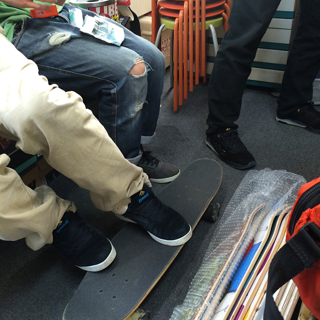 NEXXT WHEELのコヤさんがデッキを交換に。コヤさん滑ってるなー。新しいデッキは現場で見てください。滑るとやっぱり進化するのが素敵です。ここ最近は僕がコヤさんのグリップテープを貼らせてもらってます。N.T.ORIGINALのグリップテープです。毎回オーダーは、トラックのボルト穴よりわずかに内側にラインを入れる、というもので結構簡単そうで色々コツが必要な作業になります。ホイールベースに合わせてグリップテープを切る必要がありますが、切り取り線が水平にならないと見た目なんか気になるし、前後のビス穴から等間隔にラインが入るようにしたいので、最初にデッキテープを切るタイミングでかなり注意して作業を進めます。店頭では色々ご要望にお答えしてデッキテープを貼ってます。
