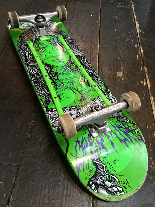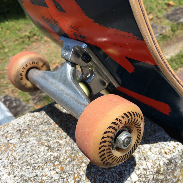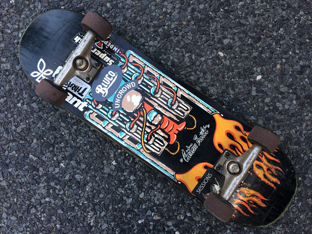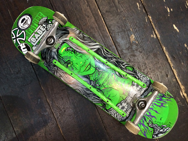 デッキはCREATUREですよ。もうナバレッティー大好き。このモデルはシリーズの中で一番タイプの女性で選んだらこのサイズに。まだ先のリリースだったのもあって、日本上陸前から予約して「入荷したらすぐに教えてください」って感じですから。さすがだ。もう頭の中ですべてが決まっているのです。INDYは軽量のFORGED HOLLOWの149。ウィールはBONES STF。SPITFIREのF4も使い倒しておりましたが、今回はBONESがしっくりきてる模様です。自分で細かくメンテしながら使っているNINJA KIKSもバリバリ現役。やっぱり機械好きっていいね。使い方っていうかモノに対する意識が違う。レールバーもCREATUREなのですが、これ探すの大変でした。でもやっぱり組み上げてみるとかなりビチビチに隙がないセッティングになりましたよ。余談ですがこのデッキはシルクスクリーンプリントでした。タクちゃんはそれを僕とふたりで見てニヤリとするスケボー変態オヤジ仲間なのであります。