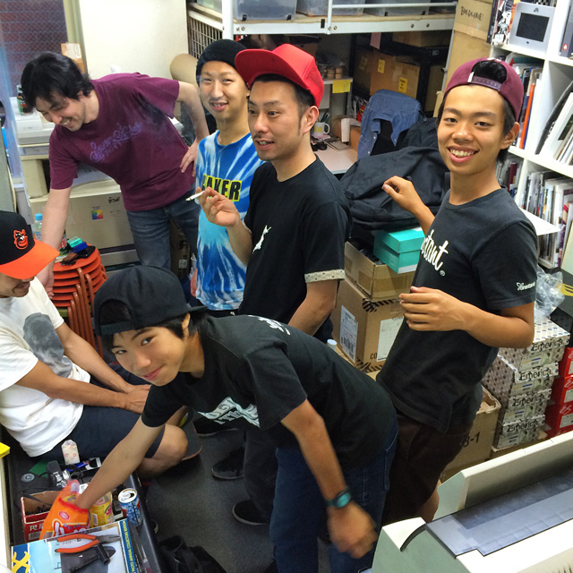 ショップのバックヤードは静かなときにはアキラと無言でカチャカチャしてますが、撮影帰りのみんなやローカル達のタイミングがあったりするといきなり祭りになってきます。ユウトらはバックヤードにある差し入れで頂いたお菓子は全部食べちゃうのよ。旨そうに食べてるの見てるの楽しいのね。どんどん成長しとる。スケートショップってそういうスケートボーダー達の社交場でありたいな、っていつも思ってます。バックヤードは僕らの仕事場なので基本ライダーやスタッフしか入れません。また商品入荷や撮影してたりして入れないこともありますが、狭いのにほんとにみんなよく来てくれてうれしいわ。松本はX残念。また次回やるぞ。
