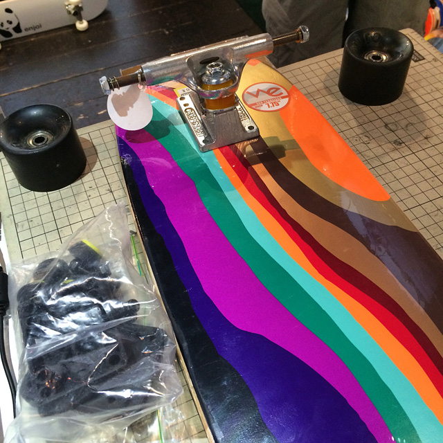 吉祥寺の先輩はクルーザーを組みに、おっと、クルーザーではなく本気のスラローム用を組みに来てくれました。クルーザーとスラローム用ではちょっとセッティングが違うのよ。ま、詳しくはまたいつかご紹介する日がくるかと。僕も探しているのがあるのですがなかなか見つからなくてね。なんかスラロームやりたいのよ。