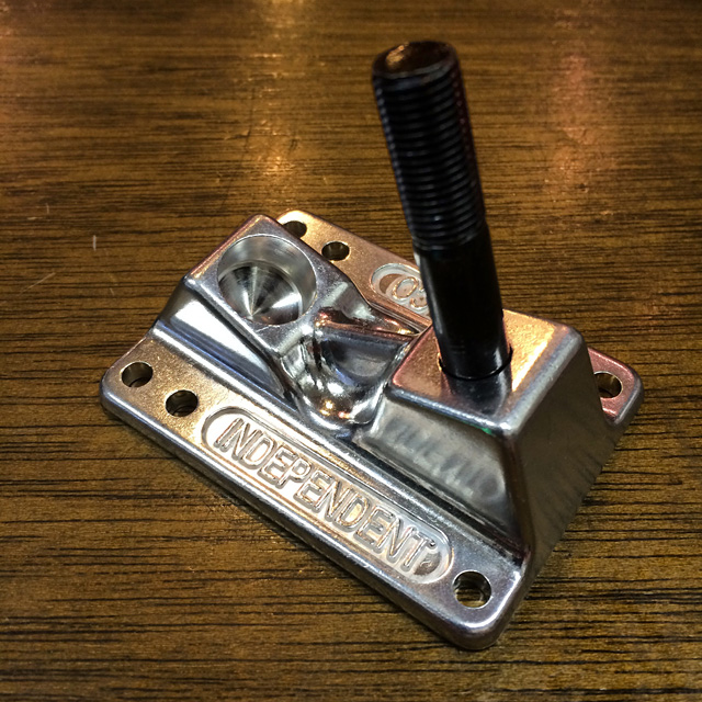 そしてこちらはINDEPENDENTのベースプレート。1500円+税。これかなり待望でした。よくみて欲しいのはこのベースプレートは6穴なんです。昔はピッチが広い方をすべてのメーカーで採用しておりました。あるときにやっぱりスライドトリックでぶつかるしってことでベースプレートの穴の位置が少し内側になったのです。今ではその短い方のピッチでトラックを装着するのがフォーマットになっているので、トラックの穴も短いピッチの幅でしか製造されていないケースが多く、例えばずーっと大事に取っておいた昔のデッキに今のトラックを装着しようとしてもピッチが違くて装着できない。そこでこのプレートの出番です。ブッシュとハンガーとピボットを付け替えればどのピッチのデッキにもトラックが装着できるようになるのです。これ大事っす。INDY好きの人はとりあえず一個っていうか前後で二個持っておいたほうがいい。あとここ最近目立つのはキングピン交換とか折れたの抜き替えるのが面倒で、ベースプレートごと付け替えちゃう人。セレブですな。