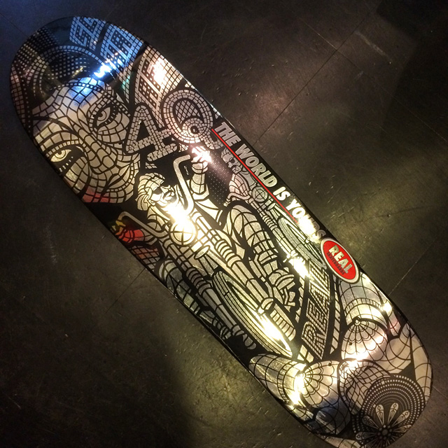 こちらはREALのNEWデッキ。Max SchaafのNEWモデル。9.25インチ。デッキって好みの幅が大きいので本当にグッとくるピンポイントが人それぞれなのですが、このデッキは僕かなりグッとくる。グラフィックやカラーやサイズやブランド、色々な要素が組み合わせってなんだかググーっときちゃうのですね。そういうデッキに乗ればいいのですが好きなデッキってなかなかシュリンクを剥がせないのです。ま、乗ってナンボだと思いますが。