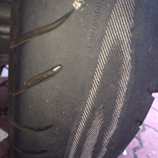 先週に続き、またまたバイクの話になってしまいますが、数日前にパンクに気づかずバイクに乗ったところ、気が付いた時にはタイヤがこの写真のようにバースト寸前でワイヤーむき出しの相当ヤバイ状態になってました。バーストしたら大事故になっていた可能性があったのでバーストしなくてホッとしています。スピード違反の反則金に続き、タイヤ交換と大きな出費になってしまいました。滑る前はウィールの大きさとかパンクしてないかとかベアリングの玉が飛んでないかとかはよくチェックするんですけどね。笑 何に乗るにしても乗る前の安全点検は必須ですね。