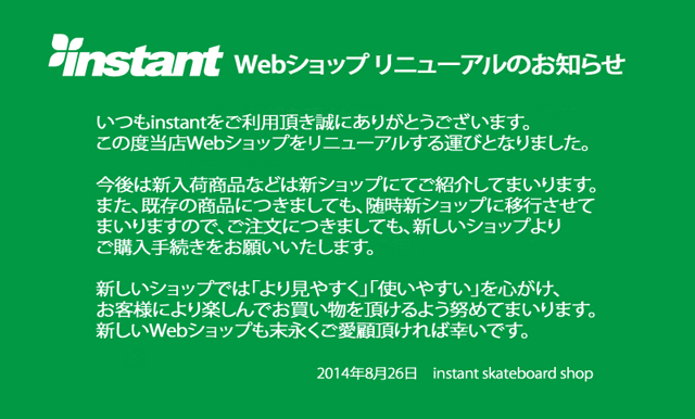 この度、instant webストアをリニューアルする事になりました!さらに使いやすく、見やすく、スケートボードの魅力をお伝えできればと思っております!