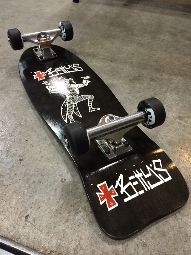 朝早めに到着して入り口で渡辺さんにパスもらって会場に入ったら、速攻で見つけたインタースタイルのツルちゃん。やばいクルーザーを組んだとのことでさっそく拝見させていただきました。こちらのデッキは80年代ストリートスケートシーンをご存知の方はちょっと「ハハー」ってなっちゃうBetty'sのデッキであります。ただ当時のデッキではなく、T19大瀧さんがシェイプしてオリジナルのプリントを施した逸品。これちょっと入手するの難しいかと。デッキを細かく見せてもらいましたが実にお見事な配慮がいっぱいでありました。70年代のサーフスタイルのシーンから80年代のストリートスケートの興隆への変遷ですね。ノーズの短いフィッシュテールがそんな感じ。でも全体のサイジングはかなり今っぽくクルージングできるスペックになっております。これ僕も欲しいな。ま、それはいいとして、ツルちゃんはインタースタイルの実働部隊長であり下町スケートフリークスの代表格でいままでもいくつかのチョイスを見せてもらいましたがやっぱり選球眼が「フリークス」な訳です。普通に滑ってるだけじゃ辿り着けないところからピックしてきたデッキやパーツをオリジナルな視点で組み合わせてくるのよ。さすがだ。